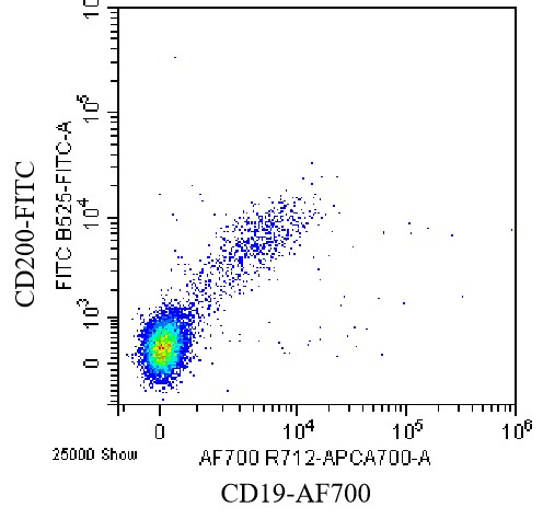• Staining of normal human peripheral blood mononuclear cells (PBMCs) using FITC Human CD200 Antibody (Clone: OX-104) (Selleck Cat#: H3556) and AF700 CD19 Antibody. Analyzed data are derived from lymphocytes.