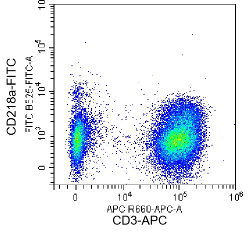 • Staining of normal human peripheral blood mononuclear cells (PBMCs) using FITC Human CD218a/IL-18Rα Antibody (Clone: H44) (Selleck Cat#: H2371) and APC CD3 Antibody. Analyzed data are derived from lymphocytes.