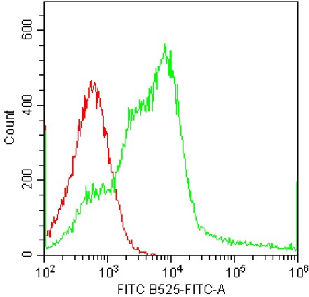 • Staining of normal human peripheral blood mononuclear cells (PBMCs) using FITC Human CD226 Antibody (Clone: DX11) (Product No.: H1201) (Green, Red: Blank Control). Analyzed data are derived from lymphocytes.