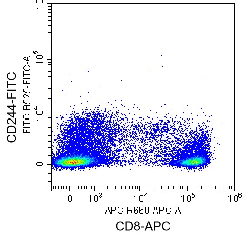 • Staining of normal human peripheral blood mononuclear cells (PBMCs) using APC CD8a Antibody and FITC Human CD244/2B4 Antibody (Clone: C1.7) (Catalog Number: H1606). Analysis data derived from lymphocytes.