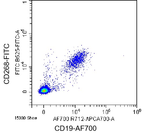 • Staining of normal human peripheral blood mononuclear cells (PBMCs) using AF700 Anti-CD19 Antibody and FITC Anti-Human CD268/BAFF-R Antibody (Clone: 11C1) (Product No.: H2161). Analyzed data are derived from lymphocytes.