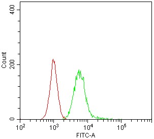 • Staining of normal human peripheral blood mononuclear cells (PBMCs) using FITC Anti-Human CD33 Antibody (Clone: WM53) (Product No.: H0916) (green, red is blank control). Analyzed data are derived from monocytes.