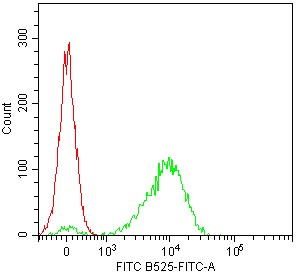 • Staining of platelets enriched from normal human peripheral blood using FITC Anti-Human CD42b Antibody (Clone: HIP1) (Product No.: H4036) (Green, red is blank cells). Analyzed data are derived from lymphocytes.