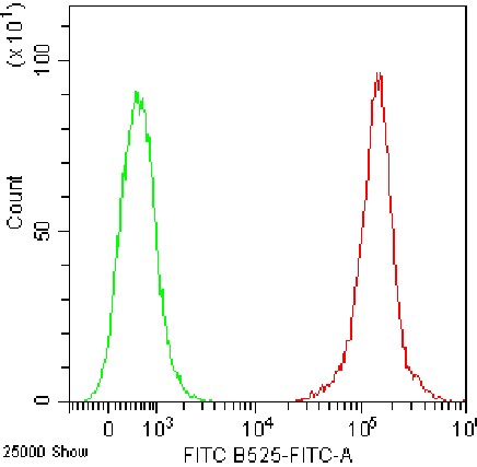 • Staining of normal human peripheral blood mononuclear cells (PBMCs) using FITC Anti-Human CD45 Antibody (Clone: HI30) (Product No.: H0091) (red, green is unstained control). Analyzed data are derived from lymphocytes.