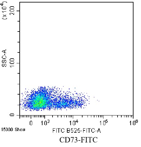 • Staining of normal human peripheral blood mononuclear cells (PBMCs) using FITC Anti-Human CD73 Antibody (Clone: AD2) (Product No.: H0361). Analyzed data are derived from lymphocytes.