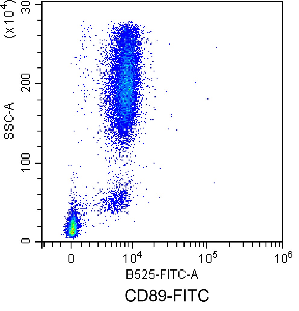 CD89是IgA的Fc受体(FcαR),一种55-75 kDa的糖蛋白,专门在外周血的粒细胞和单核细胞/巨噬细胞谱系细胞上表达,但不在淋巴细胞上表达。它也在骨髓中的早幼粒细胞以及固定单核细胞的细胞质中表达。该抗CD89的抗体不阻断IgA结合,并且比天然IgA配体更有效地分离FcαR分子。FcαR在触发吞噬作用和呼吸爆发中发挥作用。