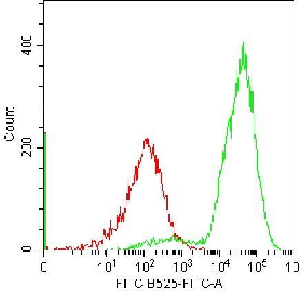 • Staining of normal human peripheral blood enriched platelets using Anti-Human CD9-FITC (Clone: HI9a) (Product No.: H4021) (Green, Red: Blank Control). Analyzed data are derived from lymphocytes.