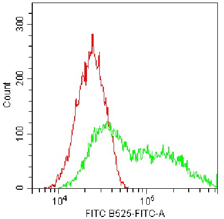 • Staining of fixed/permeabilized HEK-293F cells transfected with human IL-4 plasmid using FITC Human IL-4 Antibody (Clone: MP4-25D2) (Product No.: H0421) (Green, Red: Blank Control). Analyzed data are derived from total cells.