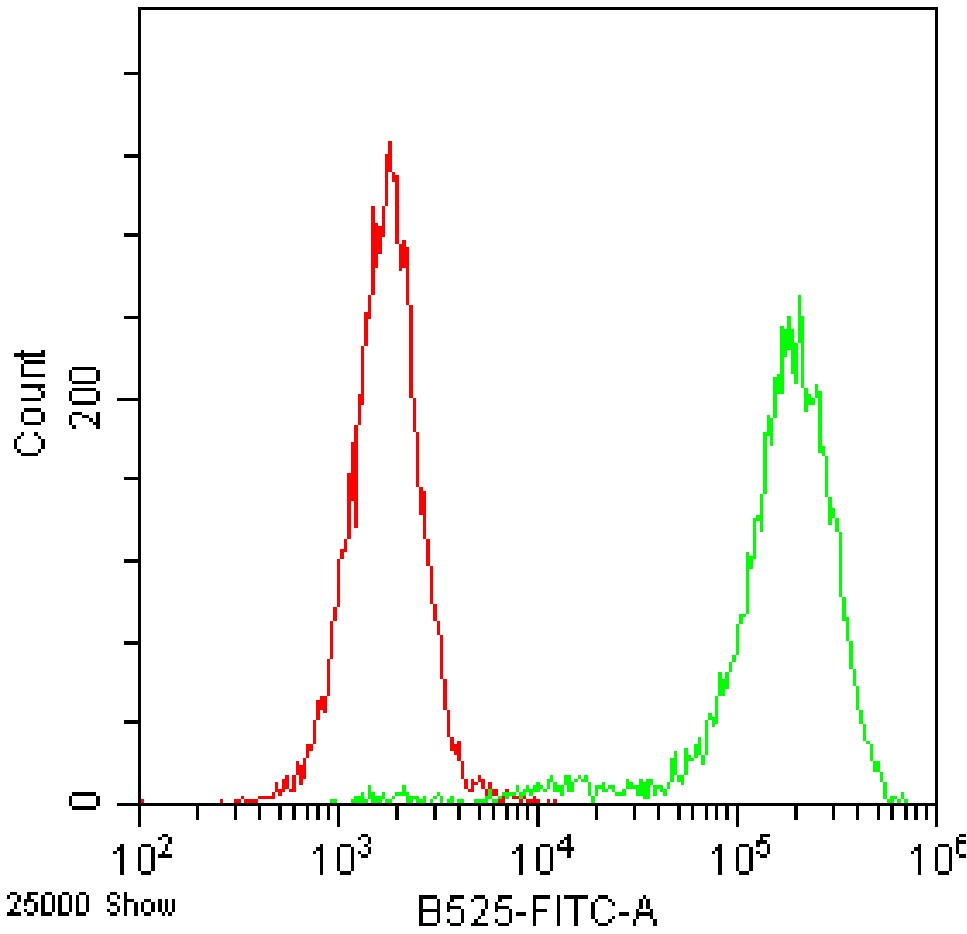 • Fixation of Hela cells with 4% formaldehyde, after washing, cells were permeabilized by adding 1000 μL of pre-cooled 90% methanol, followed by washing, and then staining of cells using FITC Human/mouse/rat β-Actin Antibody [13E5] (Selleck Cat.: G4996) (green, with red blank control). Analyzed data are derived from all cells with intact scatter.