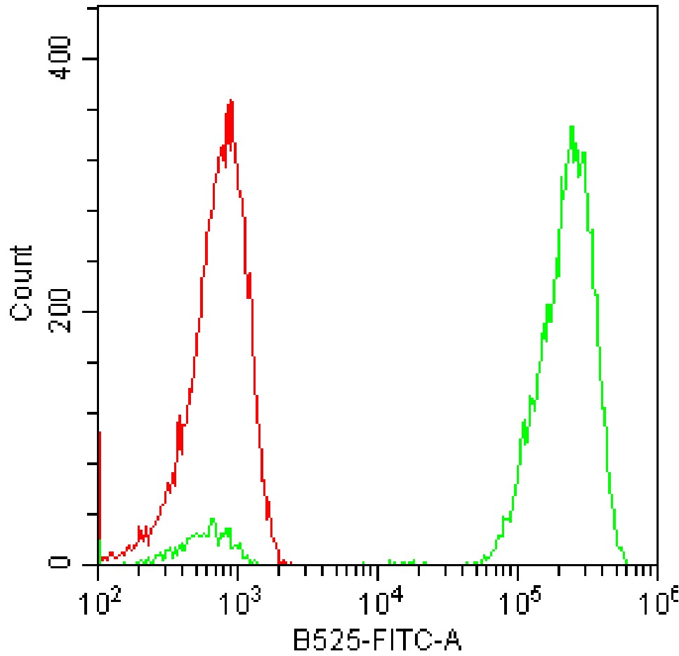 • Fixation of Jurkat cells with 4% formaldehyde, after washing, cells were permeabilized by adding 1000 μL of pre-cooled 90% methanol, followed by washing, and then staining of cells using FITC Human/mouse/rat GAPDH Antibody [14C10] (Selleck Cat.: G4981) (green, with red blank control). Analyzed data are derived from all cells with intact scatter.