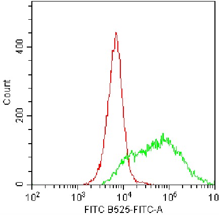• Staining of fixed/permeabilized HEK-293F cells transfected with human IRF4 (IL-18Rα) plasmid using FITC IRF4 Antibody (Clone: 3E4) (Selleck CatNo.: G2536) (Green, Red: Blank Control). Analyzed data are derived from total cells.