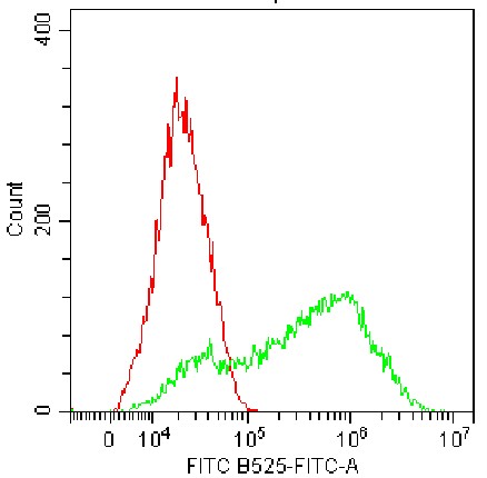 • Staining of fixed/permeabilized HEK-293F cells transfected with mouse CD107b plasmid using FITC Mouse CD107b Antibody (Clone: M3/84) (Selleck CatNo.: G2671) (Green, Red: Blank Control). Analyzed data are derived from total cells.