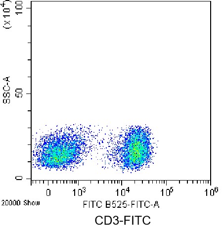 • Staining of splenic lymphocytes from C57BL/6 mice using FITC Anti-Mouse CD3 Antibody (Clone: 17A2) (Product No.: G4636). Analyzed data are derived from live lymphocytes.