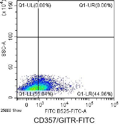 • Staining of splenic lymphocytes from C57BL/6 mice using FITC Anti-Mouse CD357/GITR Antibody (Clone: DTA-1) (Product No.: G1246). Analyzed data are derived from live lymphocytes.