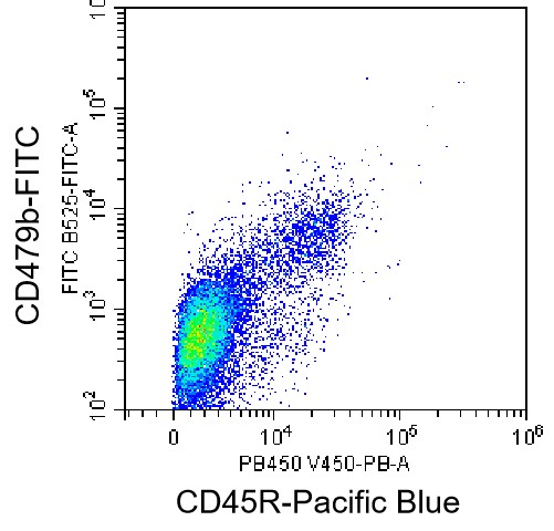 • Staining of splenic lymphocytes from C57BL/6 mice using FITC Mouse CD79b/Igβ Antibody (Clone: HM79-12) (Selleck Cat#: G1741) and PB CD45R Antibody. Analyzed data are derived from total live cells.