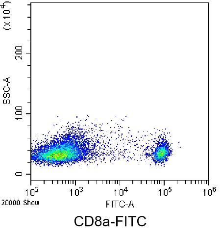 • Staining of splenic lymphocytes from C57BL/6 mice using FITC Anti-Mouse CD8a Antibody (Clone: 53-6.7) (Product No.: G4456). Analyzed data are derived from live lymphocytes.