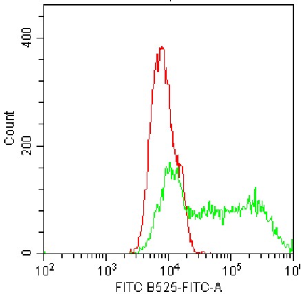 • Staining of permeabilized HEK-293F cell line cells transfected with pCMV-Il10(mouse)-3×FLAG-Neo plasmid (permeabilized using fixation/permeabilization buffer) using FITC Anti-Mouse IL-10 Antibody (Clone: JES5-16E3) (Product No.: G0781) (green, red is unstained control). Analyzed data are derived from total cells.