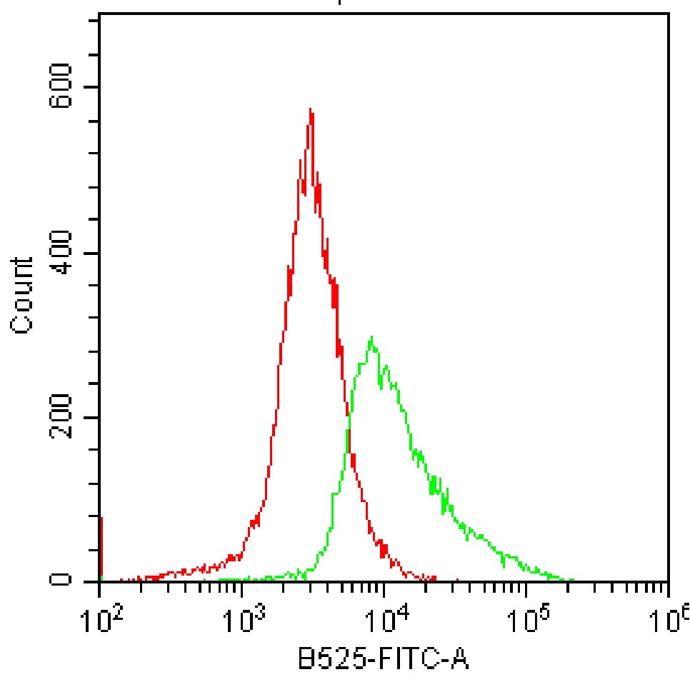 • Staining HEK-293F cells transfected with pCMV-Il2rb(mouse)-3×FLAG-Neo plasmid and fixed/permeabilized with fixation/permeabilization buffer with FITC Mouse IL-2 Antibody (Clone: JES6-5H4) (Product Number: G1066) (green, red is unstained control). Analysis was performed on total cells.