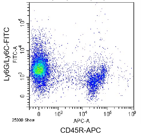 • Staining of bone marrow cells from C57BL/6 mice using APC Anti-CD45R Antibody and FITC Anti-Mouse Ly6G/Ly6C Antibody (Clone: RB6-8C5) (Product No.: G4336). Analyzed data are derived from live cells.