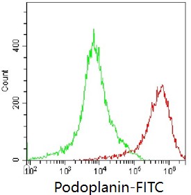 • Staining of TE-71 cell line cells using FITC Anti-Podoplanin Antibody (Clone: L7B2) (Product No.: G1291) (red, green is blank control). Analyzed data are derived from live cells.