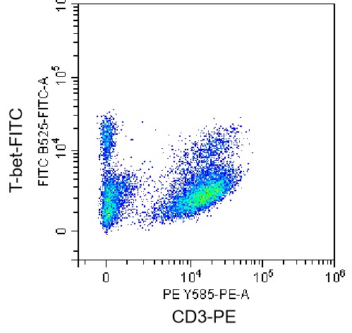 • Intracellular staining of permeabilized normal human peripheral blood mononuclear cells (PBMCs) (permeabilized using Foxp3/Transcription Factor Staining Buffer (Permeabilization Buffer)) using PE Anti-CD3 Antibody and FITC Anti-T-bet Antibody (Clone: 4B10) (Product No.: G0616). Analyzed data are derived from lymphocytes.