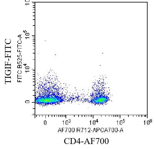 • Staining of normal human peripheral blood mononuclear cells (PBMCs) using FITC TIGIT Antibody (Clone: MBSA43) (Selleck Cat#: H1306) and AF700 CD4 Antibody. Analyzed data are derived from lymphocytes.