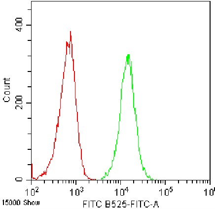 • Intracellular staining of healthy human peripheral blood mononuclear cells (HPBMCs) permeabilized using fixation/permeabilization buffer using FITC Anti-TLR9 Antibody (Clone: 26C593.2) (Product No.: H2341) (green, red is blank control). Analyzed data are derived from cells in the lymphocyte gate.