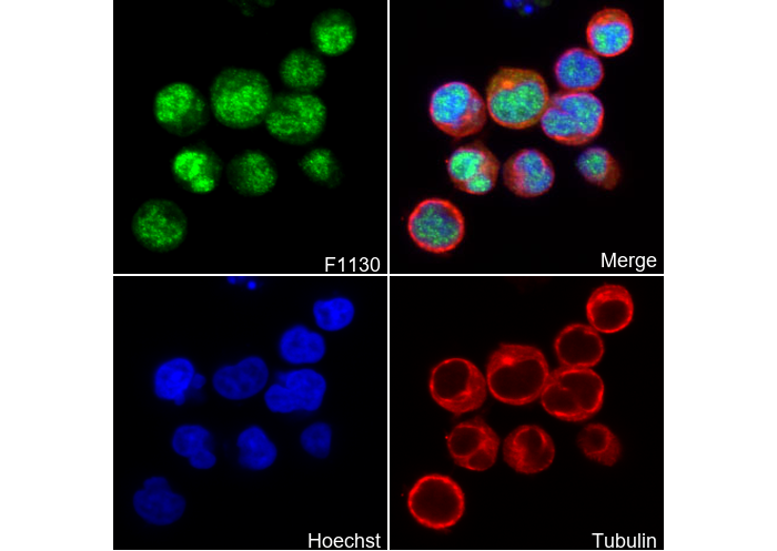 • Immunofluorescent analysis of Jurkat cells using F1130 (green, 1:100), Hoechst (blue) and tubulin (Red).