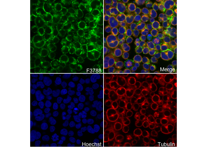 • Immunofluorescent analysis of Jurkat cells using F3788 (green, 1:500), Hoechst (blue) and tubulin (Red).