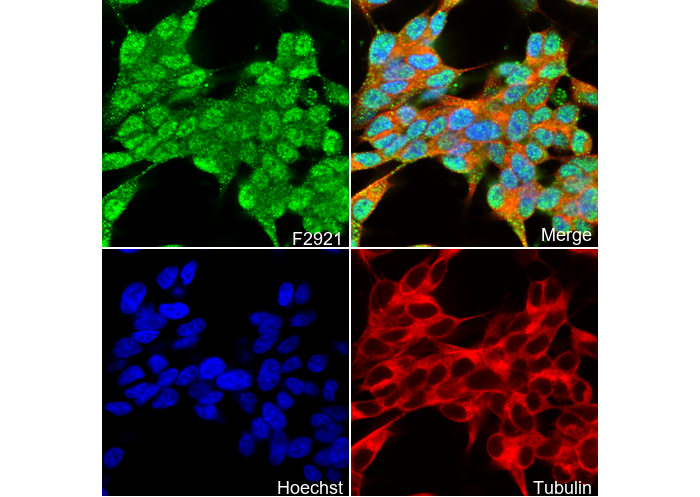• Immunofluorescent analysis of SH-SY5Y cells using F2921 (green, 1:200), Hoechst (blue) and tubulin (Red).