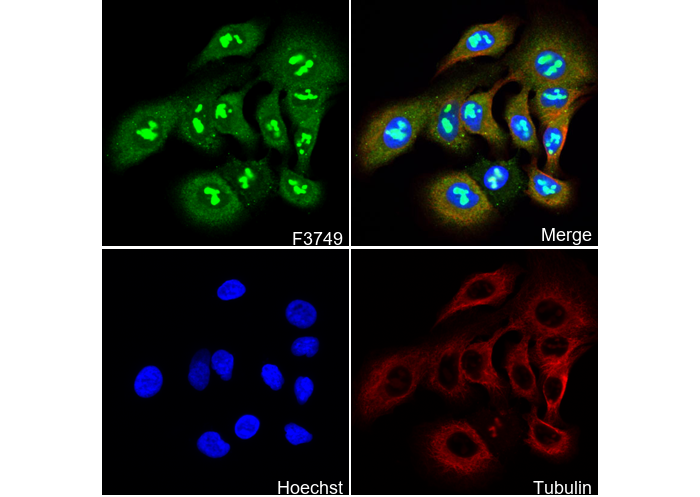 • Immunofluorescent analysis of A549 cells using F3749 (green, 1:100), Hoechst (blue) and tubulin (Red).