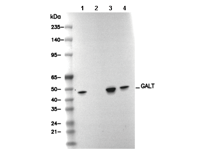 • Lane 1: HeLa, Lane 2: HeLa (KO GALT), Lane 3: HepG2, Lane 4: A549