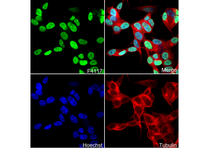 • Immunofluorescent analysis of SH-SY5Y cells using F4117 (green, 1:400), Hoechst (blue) and tubulin (Red).
