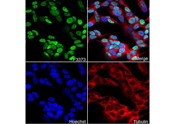 • Immunofluorescent analysis of SH-SY5Y cells using F3373 (green, 1:250), Hoechst (blue) and tubulin (Red).