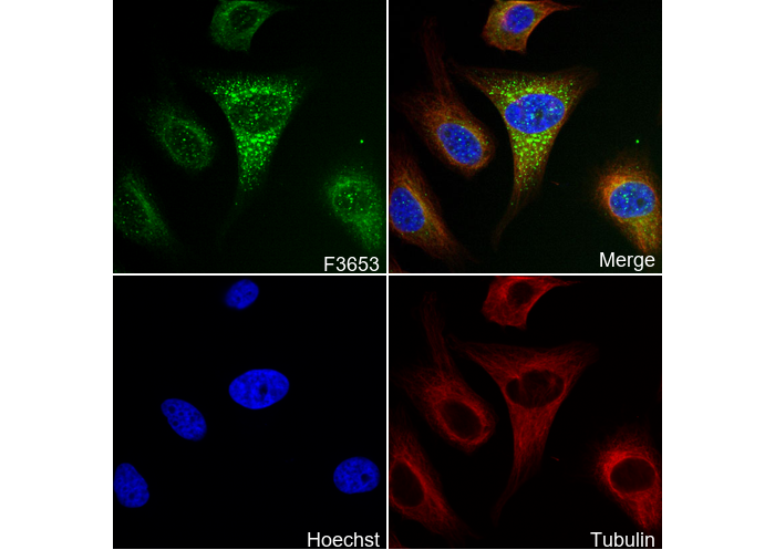 • Immunofluorescent analysis of Hela cells using F3653 (green, 1:100), Hoechst (blue) and tubulin (Red).