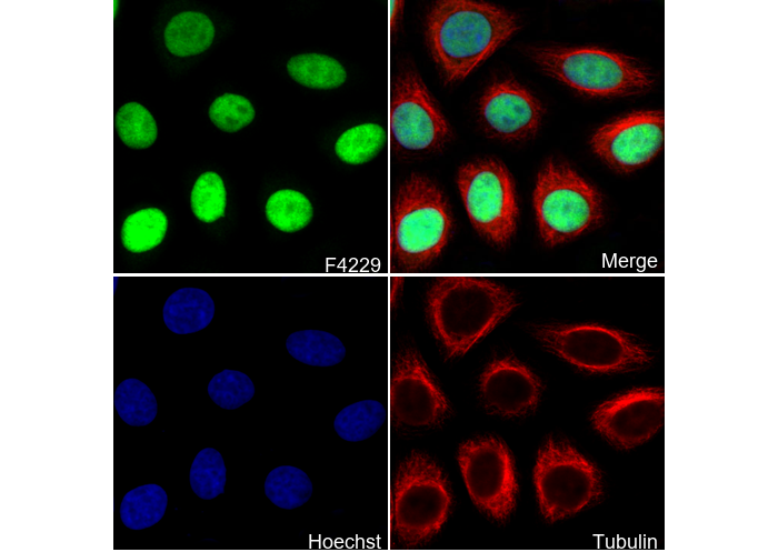 • Immunofluorescent analysis of HepG2 cells using F4229 (green, 1:800), Hoechst (blue) and tubulin (Red).