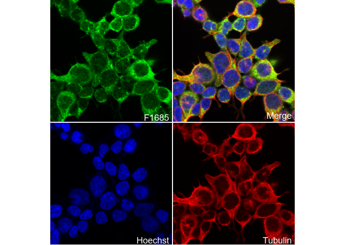 • Immunofluorescent analysis of U251 cells using F1685 (green, 1:1000), Hoechst (blue) and tubulin (Red).