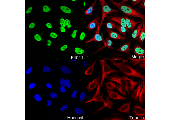 • Immunofluorescent analysis of Hela cells using F4041 (green, 1:250), Hoechst (blue) and tubulin (Red).