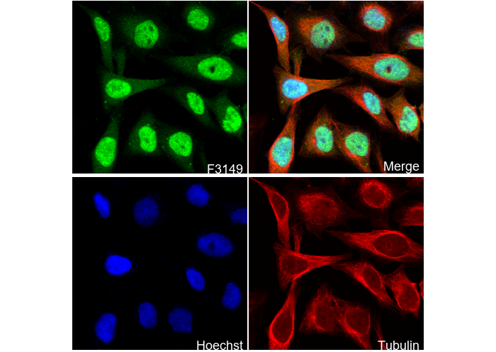 • Immunofluorescent analysis of Hela cells using F3149 (green, 1:100), Hoechst (blue) and tubulin (Red).