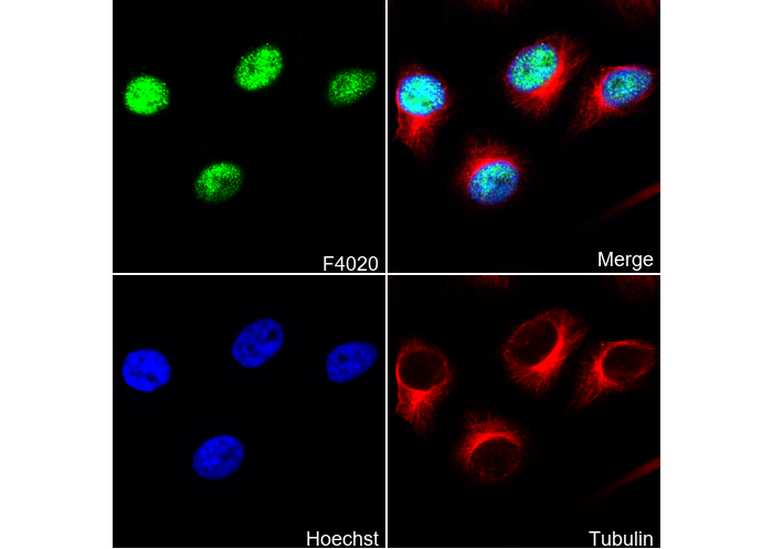• Immunofluorescent analysis of Hela cells using F4020 (green, 1:100), Hoechst (blue) and tubulin (Red).