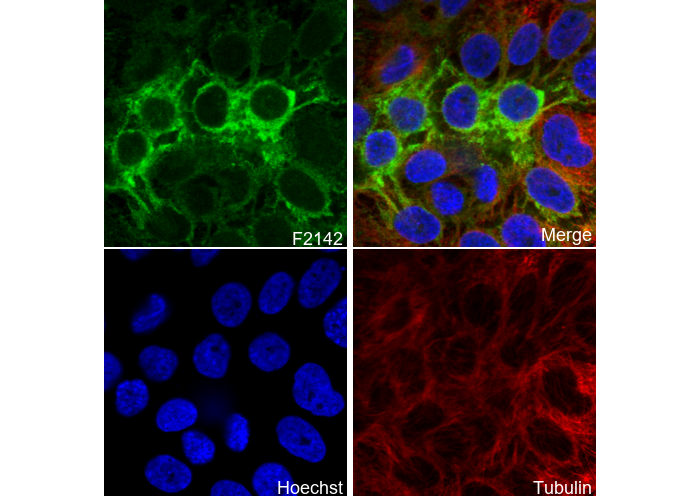 • Immunofluorescent analysis of JEG-3 cells using F2142 (green, 1:100), Hoechst (blue) and tubulin (Red).