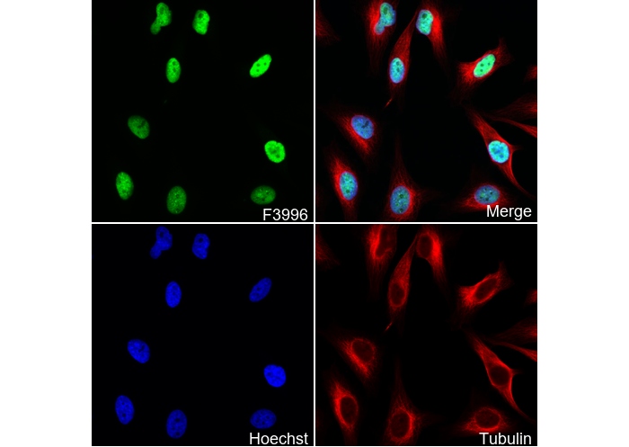 • Immunofluorescent analysis of Hela cells using F3996 (green, 1:1000), Hoechst (blue) and tubulin (Red).