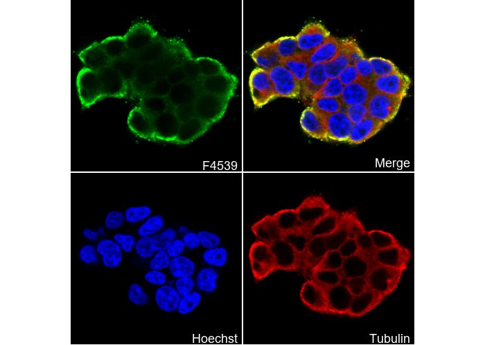 • Immunofluorescent analysis of 293T cells using F4539 (green, 1:40), Hoechst (blue) and tubulin (Red).