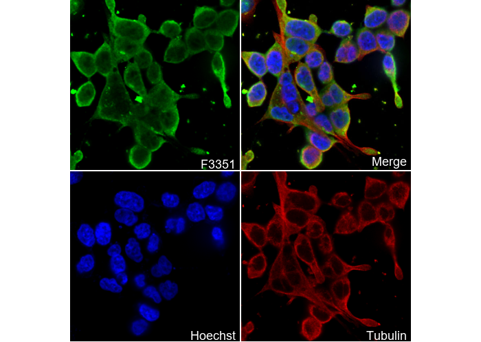• Immunofluorescent analysis of U251 cells using F3351 (green, 1:200), Hoechst (blue) and tubulin (Red).
