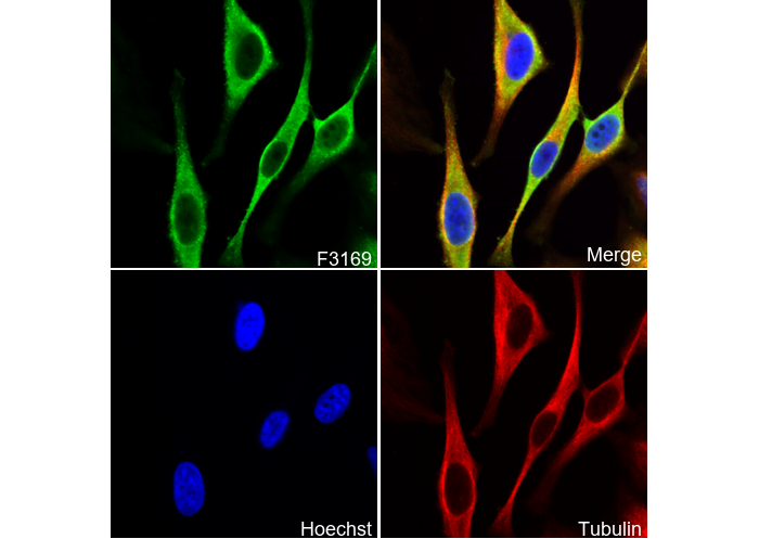 • Immunofluorescent analysis of Hela cells using F3169 (green, 1:100), Hoechst (blue) and tubulin (Red).