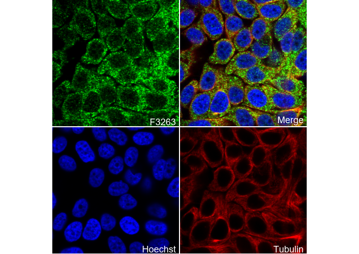 • Immunofluorescent analysis of BxPC-3 cells using F3263 (green, 1:200), Hoechst (blue) and tubulin (Red).
