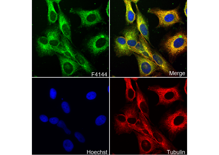 • Immunofluorescent analysis of Hela cells using F4144 (green, 1:50), Hoechst (blue) and tubulin (Red).