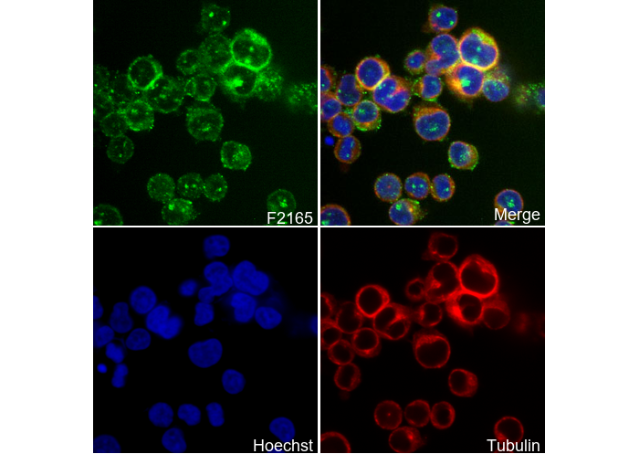 • Immunofluorescent analysis of Jurkat cells using F2165 (green, 1:50), Hoechst (blue) and tubulin (Red).