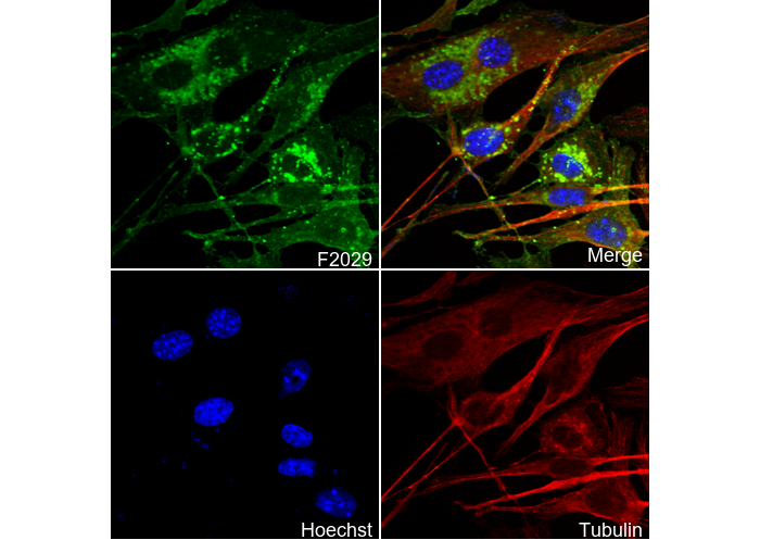 • Immunofluorescent analysis of bEND.3 cells using F2029 (green, 1:50), Hoechst (blue) and tubulin (Red).