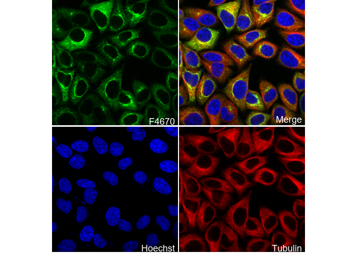 • Immunofluorescent analysis of HepG2 cells using F4670 (green, 1:800), Hoechst (blue) and tubulin (Red).